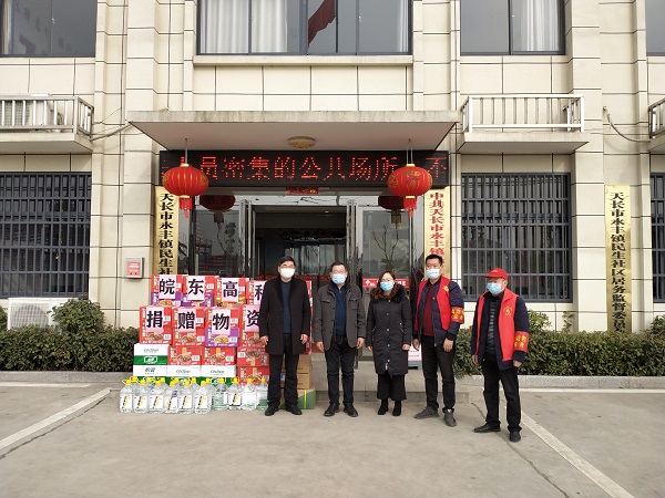 2月13日下午,皖東高科(天長)有限公司黨支部書記姚能平一行來到永豐鎮民生社區,向社區捐贈了方便面40箱、礦泉水20箱、消毒酒精16桶和一次性手套8000只等物資用以目前的疫情防控工作。