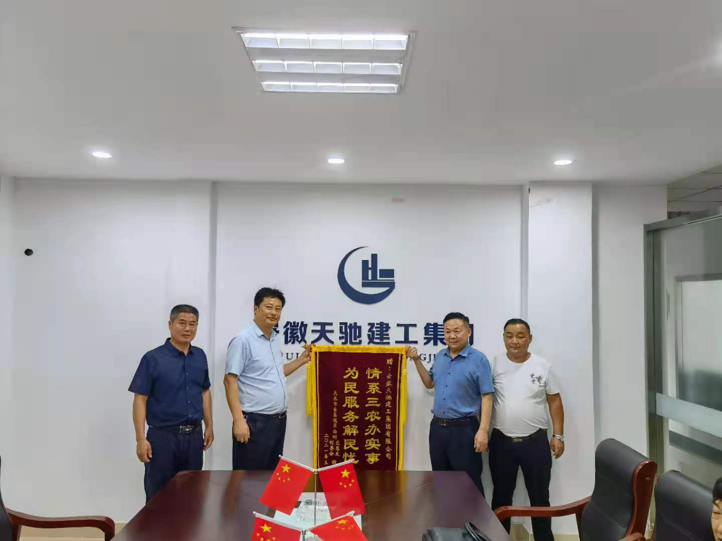 6月20日草西村“兩委”在村總支書記陳葉桃的帶領下,將書記寫著“情系三農辦實事,為民服務解民憂”的錦旗送到了安徽天馳建工集團公司,感謝該公司在高標準農田建設項目中,不畏困難,不計盈利,盡心盡責,按時按質將農田、渠道、涵閘、道路整治建設好交予群眾進行夏播夏種。