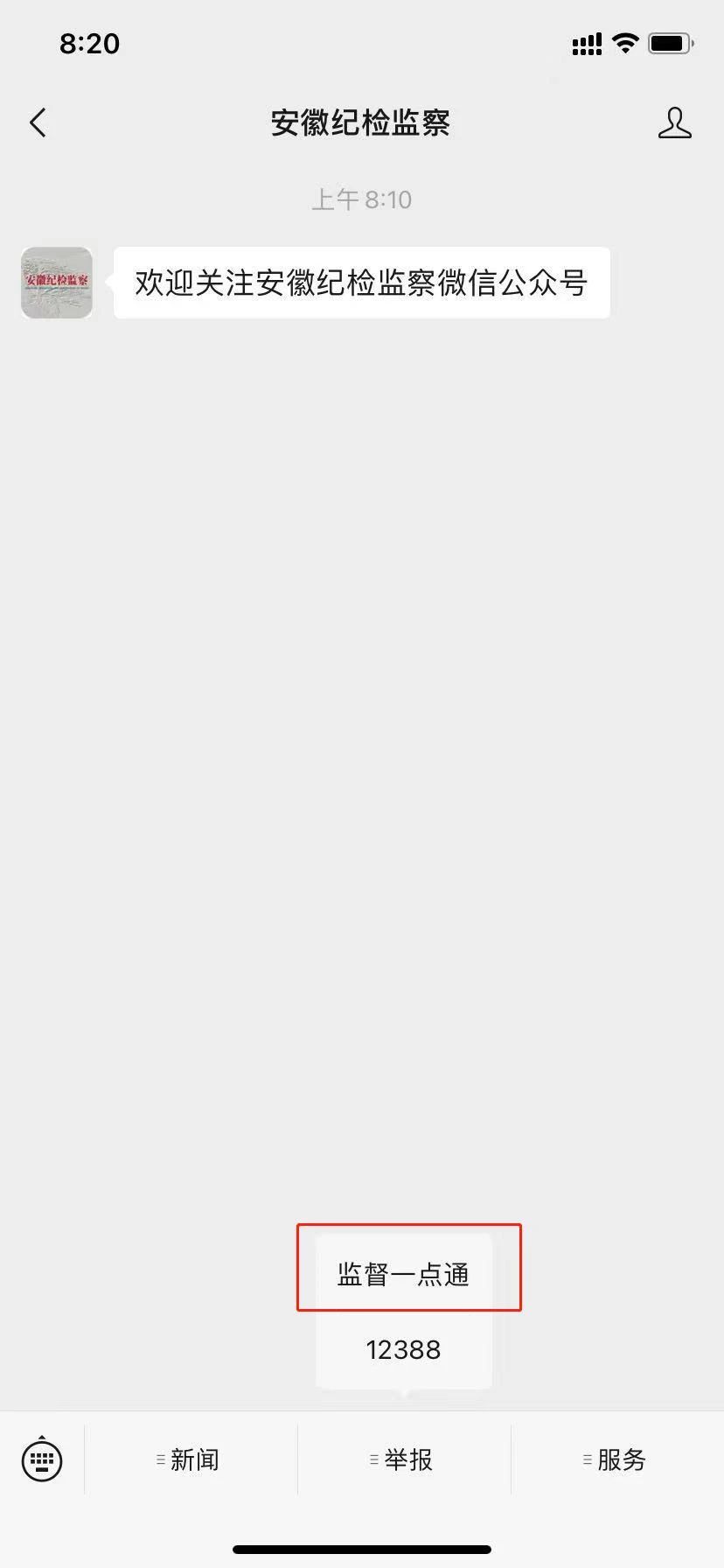 2、進入下方“安徽紀檢監(jiān)察 ”微信公眾號菜單欄,點擊“舉報”,選擇“監(jiān)督一點通”進入服務平臺。