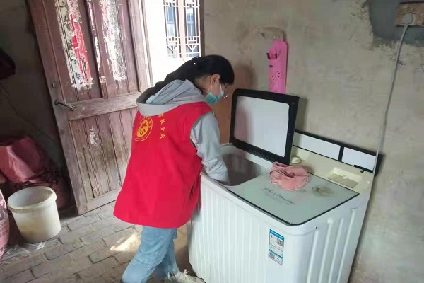 為李玉珍老人安排好之后,志愿者們又來到北尖組老黨員瞿慶龍家中,為他洗衣服、打掃庭院衛生、整理院內堆放雜物、清除房前屋后垃圾、雜物等。