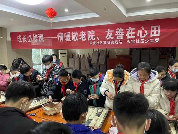 當天下午,市一小6年級14班的少先隊員們在志愿者的帶領下來到金太陽老年公寓。天氣雖然寒冷,但是阻擋不了大家的勞動熱情。男生們拿著掃把、抹布和垃圾袋,爭先恐后地幫助老人們打掃衛生,女生們則來到食堂,在志愿者手把手地指導下學習包餃子。大家忙得不亦樂乎,卻都干勁滿滿,因為能夠親身實踐,所以都很興奮。適逢當天是老人們的集體生日,志愿者給高齡老人戴上生日帽,在少先隊員溫馨的歌聲中老壽星們許下愿望吹滅生日蠟燭,志愿者把切好的生日蛋糕和美味的水餃端到老人手上,老人們吃得津津有味,高興到合不攏嘴,歡聲笑語灑滿了整個老年公寓。“真沒想到今天居然有這么多人給我們過生日,好久沒有這么熱鬧了,跟過年一樣,實在是太開心了!”78歲的馬昌梅老人激動地說。