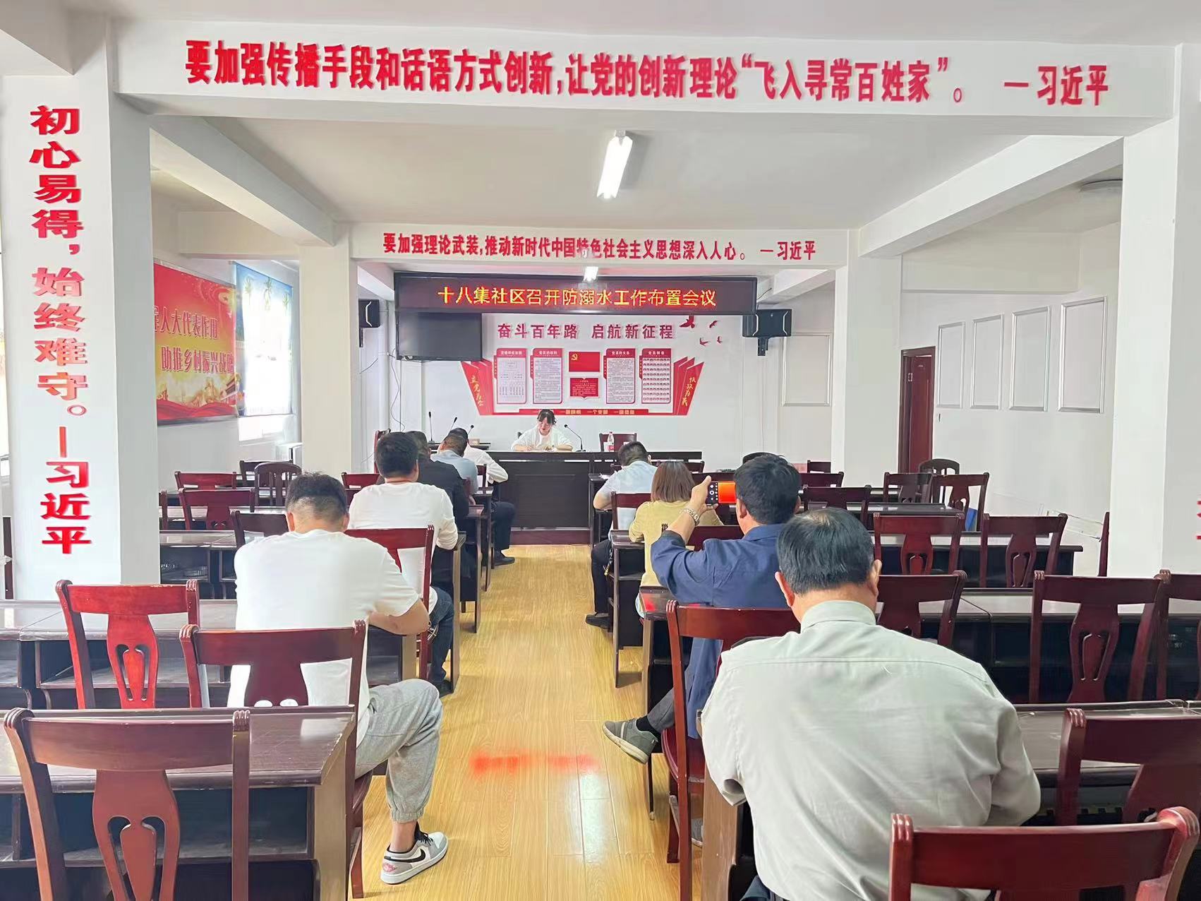 2022年5月20日,十八集社區在二樓會議室召開防溺水工作布置會議,本次會議主要強調各個水域警示牌安置的位置及救生物資是否擺放到位,以及及時提醒家長督促兒童不在危險地域玩耍。