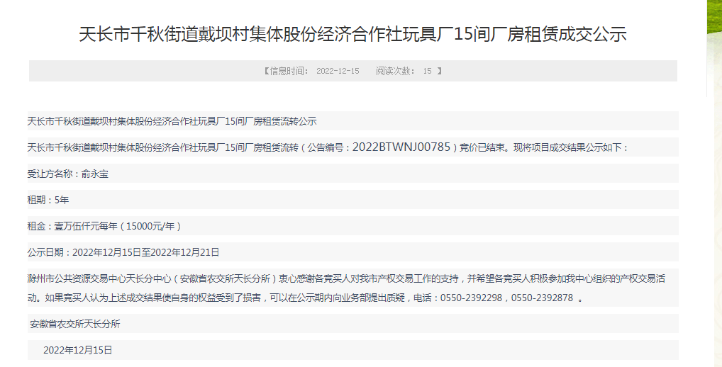 為進一步擴大村集體收入,本次招租通過滁州市公共交易中心天長分中心平臺公開招租,合同金額較之前有較大提高。