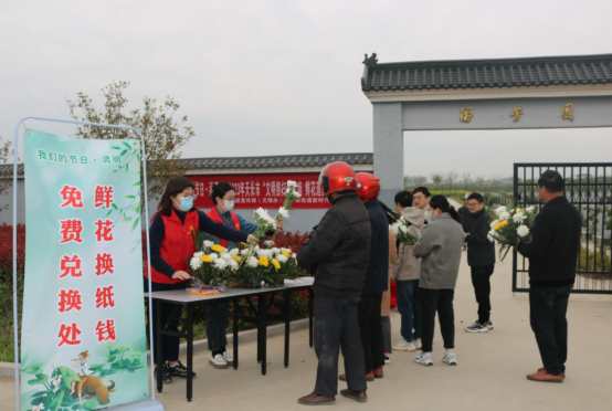 一年一度春草綠,又是一年清明時。當天上午,在絡繹不絕的祭掃人群中,祝澗村的志愿者們在墓園入口處設立了鮮花兌換點,志愿者們送上一束束鮮花兌換群眾攜帶的紙錢,并認真向其講解移風易俗的意義,積極倡導文明、綠色祭掃,勸導前來墓園掃墓的市民將所攜帶的冥幣、鞭炮等傳統祭祀用品兌換成鮮花,倡導引導更多的村民加入到文明祭掃的隊伍中來,真正實現綠色過清明,文明寄哀思。