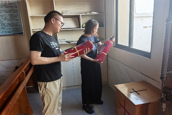 檢查過程中,聯(lián)合檢查組重點對基督教堂的消防設(shè)施設(shè)備、電氣線路鋪設(shè)、安全疏散通道以及建筑結(jié)構(gòu)等方面進行了深入排查。消防所工作人員仔細查看了滅火器等設(shè)備是否完好有效,是否在有效期內(nèi);著重檢查是否存在私拉亂接、線路老化等問題,避免因電氣故障引發(fā)火災(zāi);在安全疏散通道方面,檢查組確保通道暢通無阻,無雜物堆積,安全出口標(biāo)識清晰醒目,應(yīng)急照明設(shè)施正常運行;規(guī)劃辦工作人員對教堂建筑結(jié)構(gòu)進行了專業(yè)評估,查看是否存在建筑安全隱患。同時,還現(xiàn)場為教堂管理人員講解了消防安全知識和滅火器等消防器材的正確使用方法。