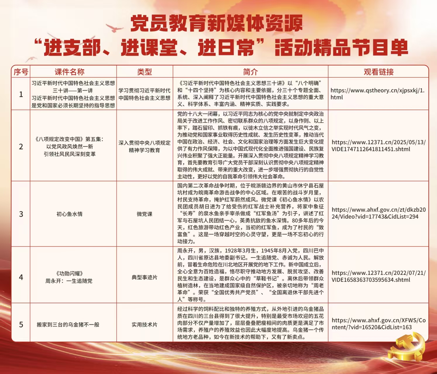 近年來,圍繞學(xué)習(xí)貫徹習(xí)近平新時(shí)代中國(guó)特色社會(huì)主義思想,認(rèn)真落實(shí)黨的二十大和二十屆二中、三中全會(huì)精神,各級(jí)黨組織創(chuàng)作出一系列黨員教育新媒體作品,集中反映了奮戰(zhàn)在經(jīng)濟(jì)發(fā)展、鄉(xiāng)村振興、基層治理等一線基層黨組織和共產(chǎn)黨員的先進(jìn)典型和感人事跡,是開展黨員教育的生動(dòng)教材。本期黨員教育新媒體資源“進(jìn)支部、進(jìn)課堂、進(jìn)日常”活動(dòng)精品節(jié)目單推薦以下內(nèi)容: